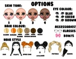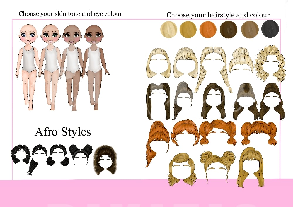 Choose from the selection sheet skin tone, hair colour, eye colour, hair style, leotard.